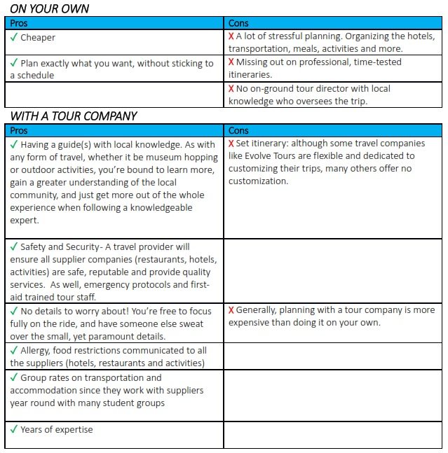 pros and cons of doing a trip on your own vs. with a tour provider.